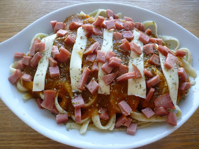 Sem esperar esfriar já vai montando o macarrão na travessa, pois assim o queijo do interior derrete facilmente. A ordem é: macarrão.....molho.....queijo....bolonha../..macarrão....molho....queijo.....bolonha e orégano para finalizar.